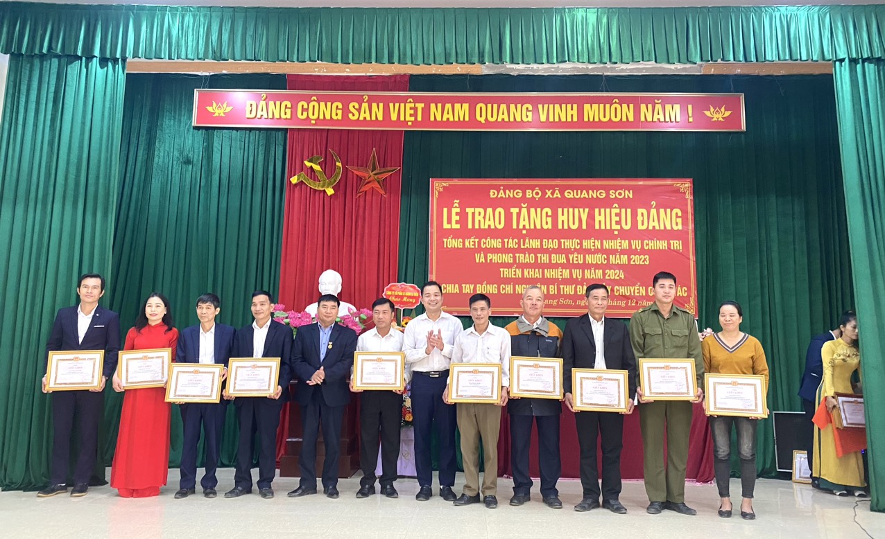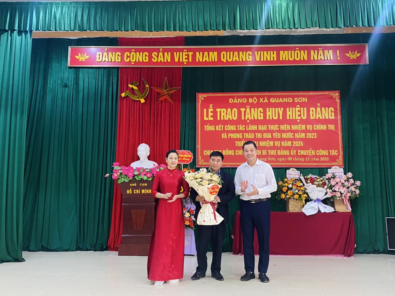 Sáng ngày 9/11/2023 Đảng bộ xã Quang Sơn long trọng tổ chức Lễ trao tặng huy hiệu Đảng đợt 02/9 và đợt 05/11 cho 08 đảng viên và tổng kết công tác lãnh đạo thực hiện nhiệm vụ chính trị và phong trào thi đua yêu nước năm 2023, triển khai nhiệm vụ năm 2024. Chia tay đồng chí Nguyên Bí thư Đảng ủy xã chuyển công tác. Dự hội nghị có đồng chí Trần Xuân Nam, UV BTV, trưởng Công an Huyện và các đồng chí đại biểu các ban xây dựng Đảng Huyện ủy; lãnh đạo một số phòng, ban ngành của Huyện; các đồng chí trong Thường trực, Ban thường vụ, Ban chấp hành Đảng ủy; các đồng chí nguyên lãnh đạo qua các thời kỳ; Bí thư, trưởng xóm, cán bộ công chức cơ quan xã; các tập thể cá nhân được khen thưởng